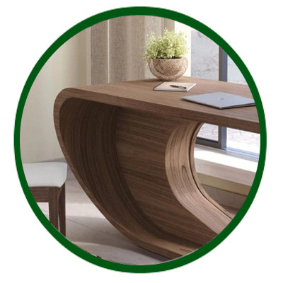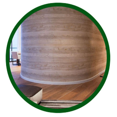 Хвилеподібні екрани для барних стійок або рецепцій – ще один приклад виробів із гнучкої фанери сейби. Еластичне деревне полотно дозволяє створювати індивідуальні предмети, які оптимально вписуються в конкретний дизайн-проєкт.