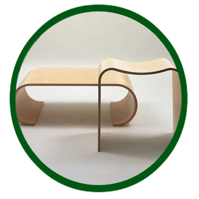 Журнальні чи кавові столики химерних форм можуть доповнити інтер'єри у стилі футуризм, модерн, мінімалізм, арт, еклектика. Вигнуті елементи спинок стільців, підлокітники крісел, деталі поручнів сходів також виробляють з цього матеріалу. Крім того, із гнутої фанери створюють круглі опори для письмових чи обідніх столів.