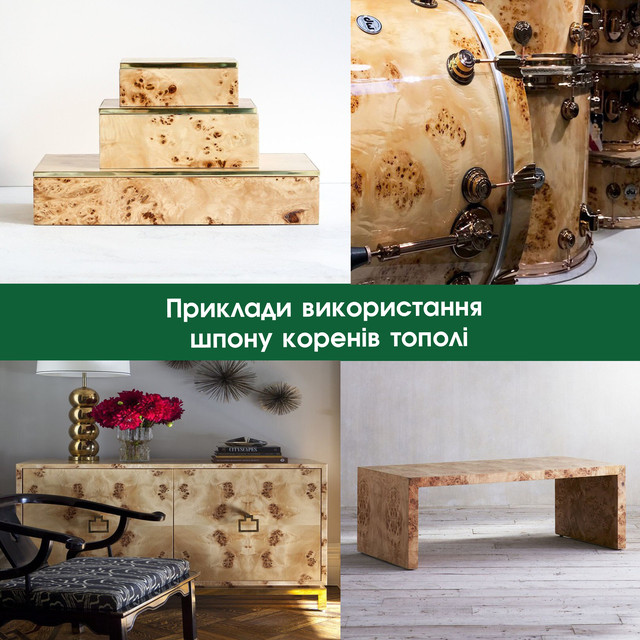 Стовбурові капи чорної тополі – це декоративний та делікатний матеріал. Кожен кап має неповторну структуру, візерунок волокон, колірну гаму. Унікальний і цінний шпон використовують для обробки виробів, які не стикаються зі значним експлуатаційним навантаженням. Шпоном облицьовують: