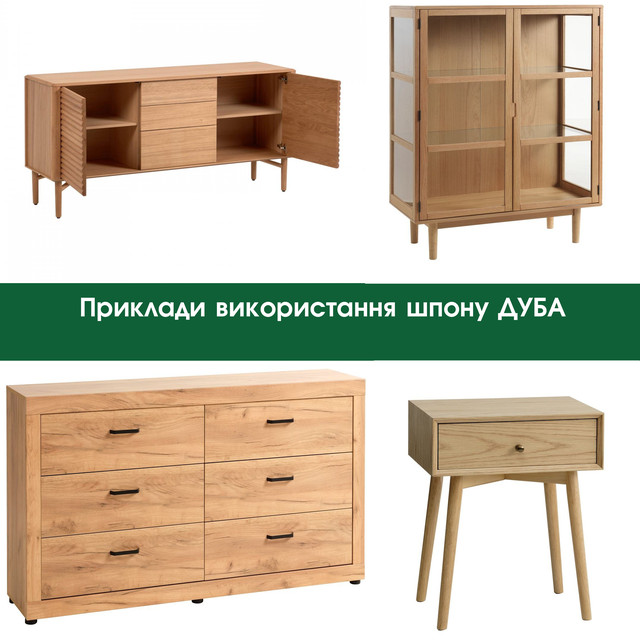 Завдяки виразній текстурі та приємній гамі жовто-коричневих тонів дубовий шпон використовують у меблевій промисловості. Столи, тумби, шафи, пенали та інші меблі, шпоновані дубом, відмінно вписуються в інтер'єри в стилі кантрі, лофт, мінімалізм, еко, неокласика, ретро.