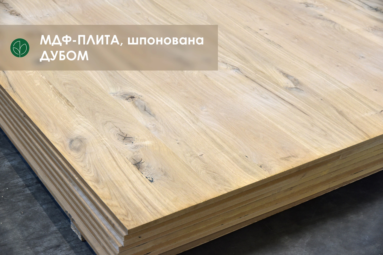 - Калібрування. МДФ-плити проходять акліматизацію і калібруються до наклеювання натурального шпону дуба в сучках (під паркет).