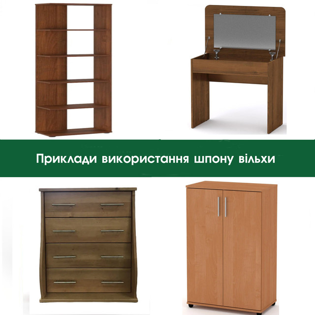 Світле дерево – важливий компонент інтер'єрів у стилі скандинавський модерн, прованс, мінімалізм, ретро, вінтаж, кантрі, еко, бохо. Шпоновані вільхою меблі – доступне та практичне рішення. Облицьовані вільхою столи та столики, тумби, комоди, пенали, шафи-купе, полиці, стелажі, трюмо тривалий час зберігають презентабельний зовнішній вигляд.